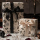 This fun feminine gothic wrapping paper is hand-drawn in black ink by Nathalie Portet, featuring whimsical skulls and blush pink and cream roses and spiderwebs against an antique white background.