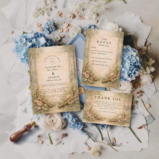 A romantic woodland-inspired design featuring soft neutral florals, elegant antlers, and a warm vintage parchment background. The composition blends organic greenery with refined details for a timeless boho aesthetic that feels both intimate and elevated. Perfect for couples drawn to nature, understated luxury, and classic romance with a rustic touch.