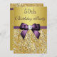 Elegant custom personalised 50th Birthday party celebration invitations with beautiful glittery golden colours printed image sequins jewels, gems pattern, cute shiny gold printed purple bows and ribbons images and pretty digital diamonds bling jewels on a chic gold gradient background with purple text. Please note: All invites on Zazzle have flat printed graphics - not real metal, bows, jewels or sequins. These classy, glamourous, glitz and glamour invites are decorated / printed on both sides. Beautiful, chic, trendy, modern party invitations. If you need assistance customising your product please contact me through my store. I will be happy to help.