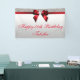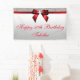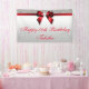 Pretty red and silver any age personalised birthday banner with a flat graphic image of silver sequins and red bow with red text.