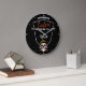 Any name custom motorcycle repairs clock with mechanic skull, tools and white and orange text inside a crest. Just pick your style, size and colour.