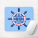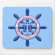 A stylish and unique mouse pad on the theme of travelling around the world by sea. A blue anchor against the background of a dark blue helm or steering wheel. Both are stylised as if they are 3d objects. Two customisable template texts of red colour go around the helm. You can change or delete them independently. They are as follows: "ANY TEXT HERE OR DELETE THIS TEXT" on the top part, "NEW YORK * 40°40'04"N 74°02'26"W * UNITED STATES" at the bottom. The third template text "USNYC" is the international seaport code and is located at the bottom of the anchor. You are free to change or delete all of them as you please. You can also change the image. Please, use the "Edit Design" or "Personalise" (as the case may be) button of the blue colour to get to the "Designer Tool" where you can change everything, including font, colour of the background, etc. Just be creative, customise and buy one, enjoy, and be happy!