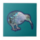 Awesome decorative tile featuring a sparkly and shimmering Kiwi Bird in the rainbow colours of the paua shell, and an outline in dark blue. In this instance the tile is a complementary blue green. The Kiwi bird is a native bird of Aotearoa New Zealand. It is flightless and is nocturnal in behaviour.