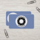 A business card template with an aperture symbol in a white circle with curved text company name and business type. Company name and business type on the front, with name and other contact details on the reverse using the white circle panel without the aperture symbol for the name and job title, arranged to the left side.