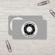 A business card template with an aperture symbol in a white circle with curved text company name and business type. Company name and business type on the front, with name and other contact details on the reverse using the white circle panel without the aperture symbol for the name and job title, arranged to the left side.
