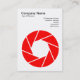 A business card template with a bold aperture symbol. Company name, business type and address on the front with name, job title, telephony, web and email addresses on the back, with the same layout.