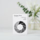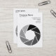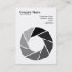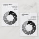 A business card template with a bold aperture symbol. Company name, business type and address on the front with name, job title, telephony, web and email addresses on the back, with the same layout.