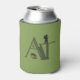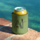 The letters "AT" in olive green are the foundation for the design on this can cooler. Incorporated into the lettering are some of the natural attractions of the Appalachian Trail including the silhouette of a wild pony, wildflowers, the silhouette of a hiker and an extra peak on the "A" to resemble mountains. The phrase "The Appalachian Trail" running along the inside of the wider leg of the "A" completes the design.
