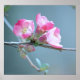 A photograph of an apple tree branch with pink apple blossoms on a blue/grey background.
