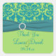 This apple green and turquoise damask wedding favour sticker has a matching faux ribbon with jewels. It matches the wedding invitation shown below. You can use it to attach to your wedding favours, or seal your thank you cards with. Other shapes and sizes are available.