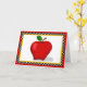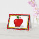 Send cheerful greeting or note by using this charming Apple Greeting Card. This shiny apple is an original illustration created by Debi Payne Designs. Its vibrant red is features a shiny highlight as the light reflects from the side of the apple and it is accented with a brown steam and green leaf to indicate it ripe freshness. The apple is surrounded by a classic black & white chequerboard border accented with a golden yellow inner liner all on a deep red background. Customise your card by adding your name or any text you choose. Create a set of cards to make a perfect gift for any teacher, cook, chef, doctor or nurse.