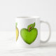 Sweet teacher's gift mug, with graphics of a red, a yellow and a green heart shaped apples. Customise to add your own text.