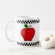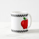 Start your morning off with a cup of coffee in the charming Apple Mug. This shiny apple is an original illustration created by Debi Payne Designs. Its vibrant red is features a shiny highlight as the light reflects from the side of the apple and it is accented with a brown steam and green leaf to indicate it ripe freshness. The apple is surrounded by a classic black & white chequerboard border accented with a golden yellow inner liner all on a deep red background. Customise your mug by adding your name or any text you choose. This will make a perfect gift for any teacher, cook, chef, doctor or nurse.