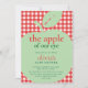 The Apple of our Eye Green Red Baby Shower. Available digitally and printed. Easily personalise the words as required which are within an apple shape. With a red gingham background.