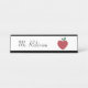 Easy to personalise teacher desk name plate featuring simple black script typography on a clean white background complemented with a red apple.