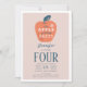 This cute "An apple picking party" girl's birthday invitation card features a red apple with navy blue leaf on a pink background framed by a white border. The reverse side features a coral pink background with floral apple patterns. Personalise it for your needs. You can find matching products at my store.