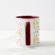 Stylised apples and seeds scattered on a coffee mug accented with red handle and interior.