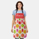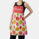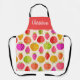 This is custom apron with unique mid century colourful apples and strawberries pattern with retro atomic stars in vibrant colours like red, yellow, purple , pink and green.