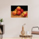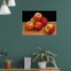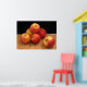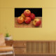 This poster features a very simple still life composition of six beautiful shiny red and yellow apples on a straw mat against a black background.