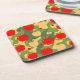 This coaster features an apple camo pattern in shades of red, green, tan and brown. The apples are in varied sizes in a pop art vector art style. The art style is trending on artstation. The coaster is a hard plastic coaster with a non-skid cork backing. There are six plastic coasters with cork backs in the coaster set. The coasters are great for parties, home use and business branding.