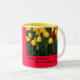This is a beautiful mug with a yellow inside and red on the outside with a refreshing picture of spring tulips and the famous saying "April showers bring May flowers"
