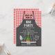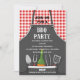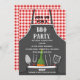 This design features a red gingham background with an apron filled with all the BBQ party essentials. Easy to personalise with your party info. Perfect for any occasion.