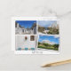 Postcard with a collage of four images of Apulia, like trulli in Alberobello, city beach in Polignano a Mare, a street shrine in Ostuni and white city Ostuni with photos with a white edge and one twisted like it is loose and with the text: 'Apulia'. It is a great vacation souvenir.