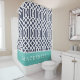 Custom shower curtain featuring a modern trellis print in navy blue, turquoise and white colours. Personalise it with your name or other text along the bottom. Use the design tools to change the background colours to match any bathroom decor. Add your own text and photos to personalise the design and create a one of a kind monogrammed shower curtain.