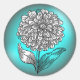 A dainty flower full of petals on a stem with two leaves with an aqua and teal background