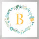 Aqua and Yellow Monogrammed Floral Wreath Poster