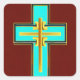 Aqua and gold cross on red background.