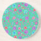 A pretty round, sandstone coaster, with a pattern of bright flowers in purple, turquoise, pink and orange on an aqua background, from a handpainted paper collage by Judy Adamson. You can easily change the background colour, if you wish, by using the Edit button.
