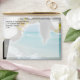 Refreshing and classy design features an aqua teal blue ocean shore scene with white waves crashing on the coast. Fresh clear blue water and white sand with blue sky and white puffy clouds. In the foreground is a beautiful white orchid flower close-up in high quality. This serene and tranquil zen image is perfect for a beach wedding, or spa resort vacation travel themed special event or business occasion. Relax while getting a massage, spa manicure or pedicure at the salon. Enjoy relaxation and peacefulness by the beach and ocean shores. All Designs Copyright © 2012 www.CustomInvitesOnline.com