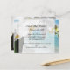 Refreshing and classy design features an aqua teal blue ocean shore scene with white waves crashing on the coast. Fresh clear blue water and white sand with blue sky and white puffy clouds. In the foreground is a beautiful white orchid flower close-up in high quality. This serene and tranquil zen image is perfect for a beach wedding, or spa resort vacation travel themed special event or business occasion. Relax while getting a massage, spa manicure or pedicure at the salon. Enjoy relaxation and peacefulness by the beach and ocean shores. All Designs Copyright © 2012 www.CustomInvitesOnline.com