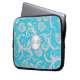 This bright aqua blue and silver floral damask laptop sleeve has FAUX silver medallion with a text box for you to add your own name, monogram, or other text. If you need any help customising, please email niteowlstudio@gmail.com.