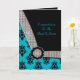 Gorgeous aqua blue with a black damask overlay on a black background. A curved diamond like gem border with a floral cut black and diamond like embellishment.