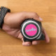 Tape Measure featuring your name in an aqua blue script font on a hot pink background. Bold and colourful design.