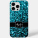 Aqua blue faux glitter sparkles Monogram iPhone 15 Case. Personalise Sparkly iPhone case with your initial and name. Beautiful girly glamourous light blue shiny glitters sparkles. Photo of blue sparkles not actual glitter!