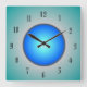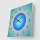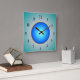 An aqua/blue moonlike circle with light green cream background. Numbers are in black, old English style. Can be purchased in square or round shapes also with a frame.