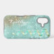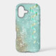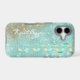 This glamourous phone case has a background of glittery star shine with an aqua blue textured look. Like tiny jewels fitted together, it sparkles! At one side is a bit of rusty gold overlay to add interest, and the other side has an image of an aqua and gold curled ribbon cascading down. Your name is in white script. Unique, and pretty, too!