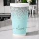 Aqua Blue - Teal and Silver Faux Foil Metallic Sparkle Glitter Script Monogram Name Latte Coffee Cup Mug. This makes the perfect sweet 16 birthday, wedding, bridal shower, anniversary, baby shower or bachelorette party gift for someone that loves glam luxury and chic styles.