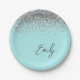 Aqua Blue Teal Silver Glitter Monogram Paper Plate