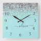 Aqua Blue Teal Silver Glitter Monogram Square Wall Clock
