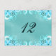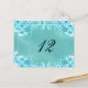 © Sunny Mars Designs - Floral Hibiscus: Dark Aqua Blue or Turquoise Wedding Table Number Cards - Beautiful, designer custom wedding reception table number card template with a modern, elegant illustration of a pretty, classy aqua blue swirly hibiscus floral decoration against a teal background.