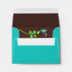 This turquoise blue and brown FAUX crackle A2 envelope has a pair of turquoise blue love birds sitting on a lime green leafy vine. It matches the wedding invitation shown below and is designed for use with the RSVP card, also shown below. If you require any other matching items in this design, please email your request to niteowlstudio@gmail.com.