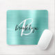 Aqua Brushed Metal Black White Script Monogram Mouse Pad