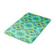Bath mat in a tie dye pattern in shades of cobalt blue, green and yellow with an aqua / seaglass green background