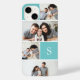 Chic photo collage phone case features five of your favourite photos in a gridded layout with contrasting turquoise aqua squares. Personalise with your single initial monogram in classic white lettering.