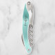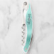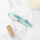 This distinctive personalized corkscrew features a modern aqua brushed metal background. Customize it with their name in stylish black handwriting script over a white monogram initial.