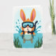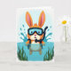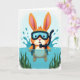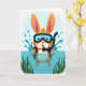 This design shows a friendly long-eared swimmer rising from sparkling blue water, its warm orange-and-cream fur contrasting with cool teal and green tones 🐰. The character looks straight ahead with a gentle, inviting gaze, like it’s sharing a private joke with a close friend. Rounded diving goggles sit over its eyes, and a black breathing tube curves up along one side of its face, adding a small touch of adventure. Around its shoulders, bright splashes arc outward in layered droplets, giving the scene a lively sense of motion. Beneath the surface, soft green aquatic plants fan out and sway, creating a calm underwater garden that frames the character like a quiet companion. Near the top, the greeting text is centered in a light coral color, standing out against the pale sky-blue background 🌷. The shading stays soft and airy, with pale highlights on the water and small bubbles scattered near the creature’s chest. In the lower area, the water shifts from deep blue to lighter aqua, with ripples and leaf shapes visible just under the surface.